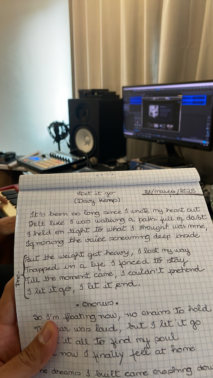 Escrevi a letra depois de ler um texto que me fez refletir por horas sobre minha vida — sobre quanto sofri tentando ser quem eu não era, ou tentando agarrar coisas que não eram pra mim. Ontem, ao ver a música ganhando forma — da bateria à voz — senti uma alegria que talvez só quem já foi pai ou mãe possa entender.